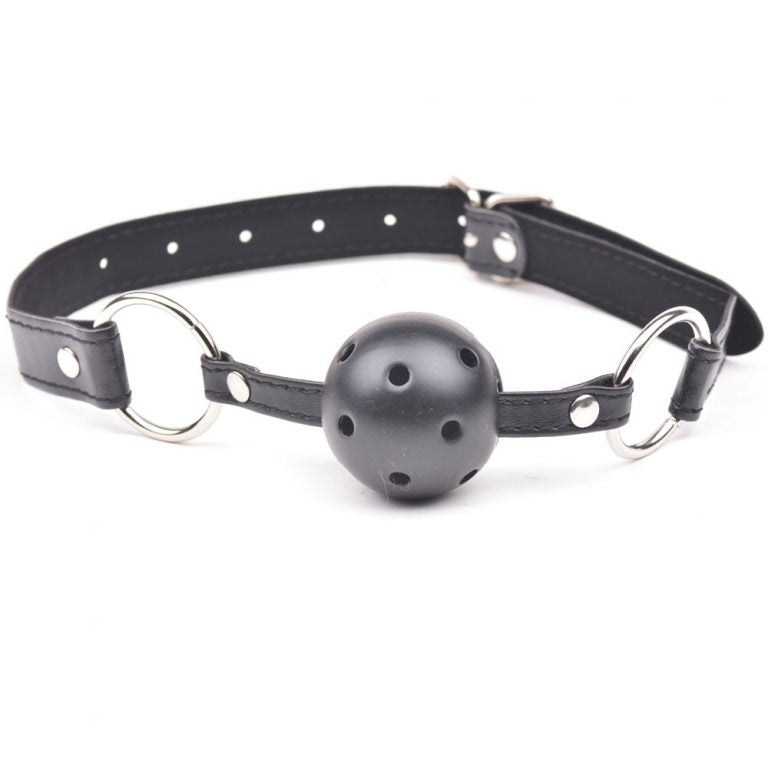 Bozal De Eco Cuero Con Bola Negro. Un accesorio bondage/sado de uso básico y común. Correa ajustable y bola con orificios para poder mantener la respiración de quien lo usa.
