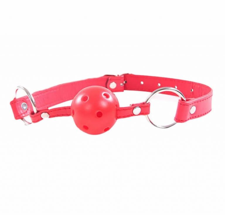 Bozal De Eco Cuero Con Bola Rojo. Un accesorio bondage/sado de uso básico y común. Correa ajustable y bola con orificios para poder mantener la respiración de quien lo usa.